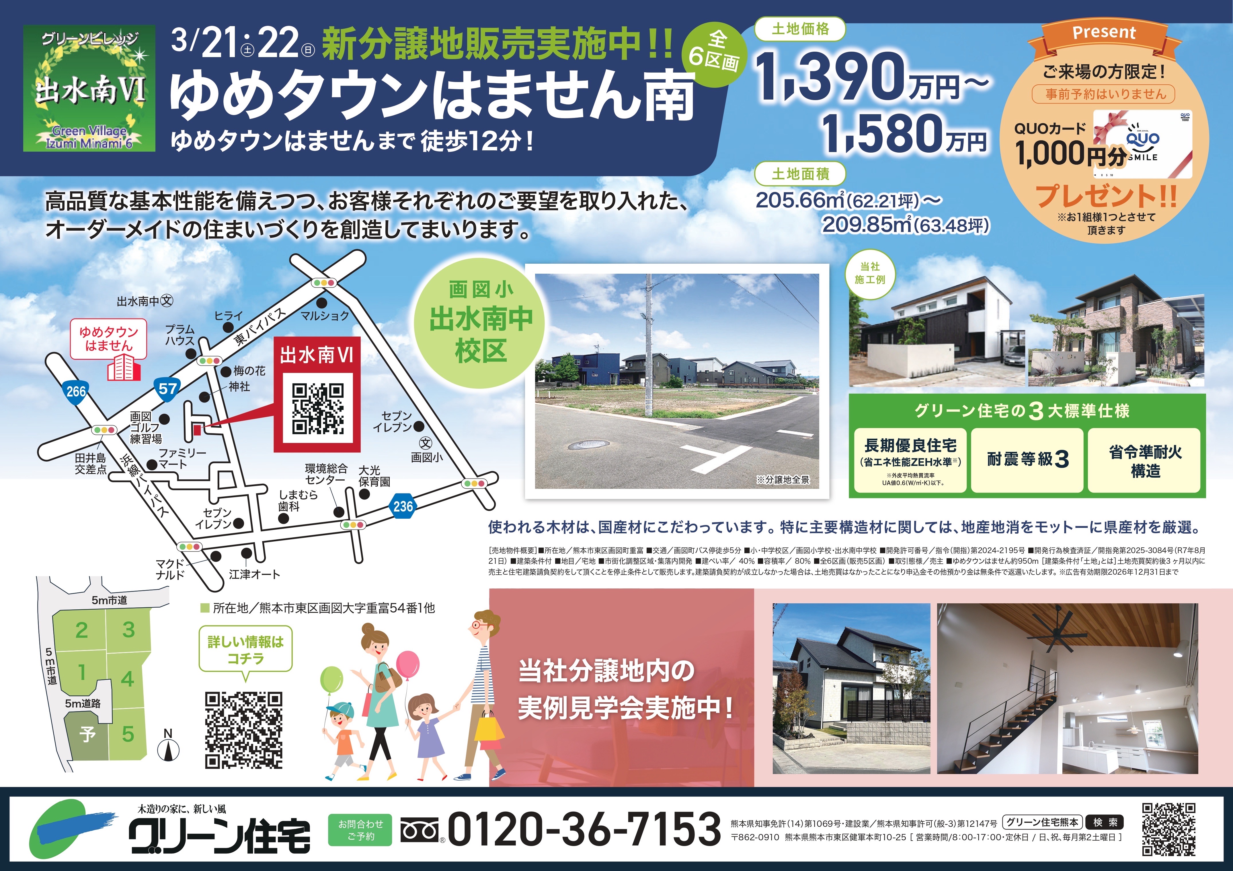 ホーム イベント予告 グリーンヴィレッジ出水南Ⅵ 新分譲地販売会 日時令和7年3月21日(土)・22日(日) 場所熊本市東区画図 お申し込み 参加ご予約フォーム 電話をご利用の方はこちら ■このページはインラインフレームを使用しています。■ご使用になられているブラウザでは、これらの機能がサポートされていない可能性があります。 電話でのご予約 TEL.0120-36-7153 [営業時間] 8:00~17:00[定休日] 日祝、第2土曜日、第4水曜日